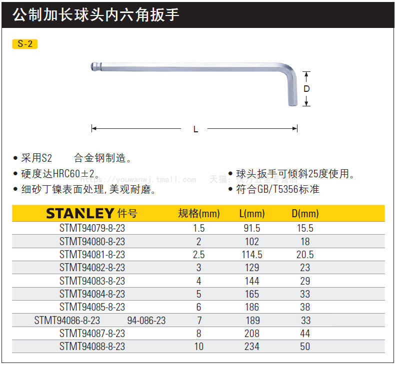 Stanley Tool Lengthened Ball Head Inner Hexagon Wrench Single S2 Inner Hexagon 1 5 2 2 5 3 4 5 6mm