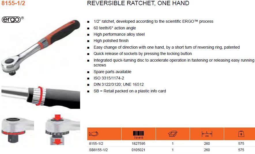 Bahco hundred solid 1 2in socket wrench with ratchet handle 8155-1 2 1827595 spot