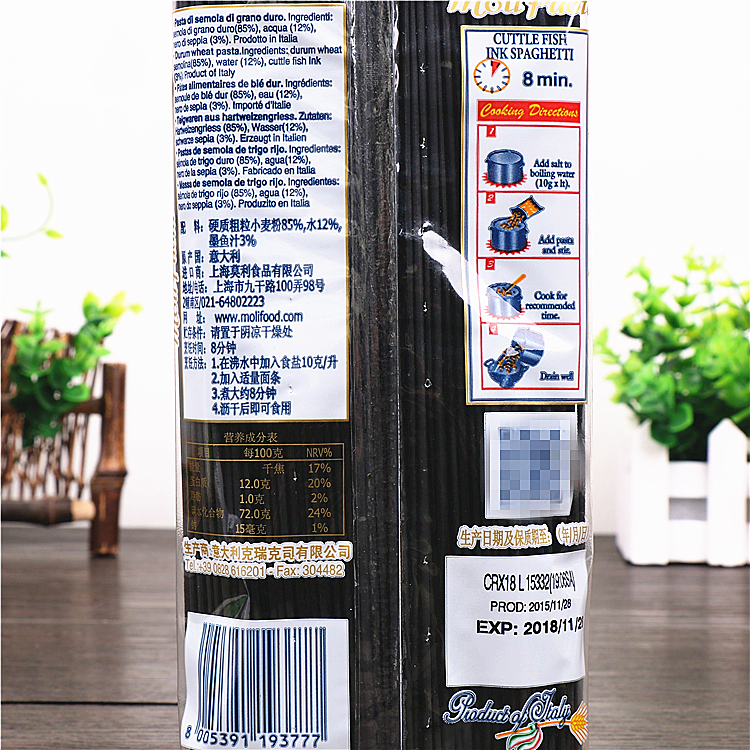85% durum semolina, 12% water, 3% cuttlefish juice, etc. The actual information on the product packaging shall prevail