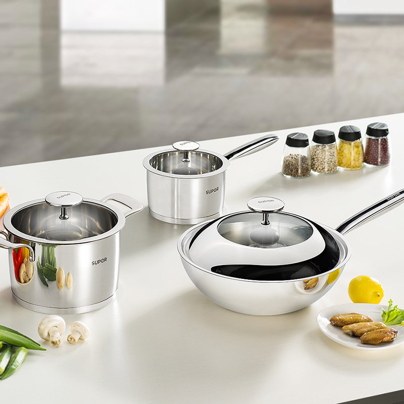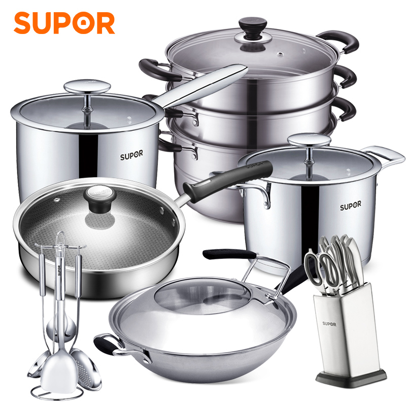 Supor wok frying pan steamer 304 stainless steel set pot Less fume pot combination electric gas universal