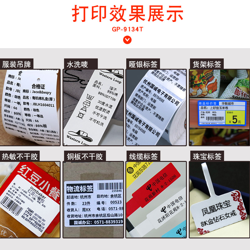 Jiabo GP9134T 9025t label printer self-adhesive 300 point jewelry label machine washing water mark washing label clothing tag certificate of conformity pet dumb silver paper cable Bluetooth barcode printer