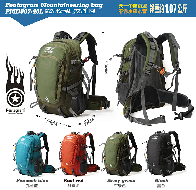 Pentagram pentagram 40L anti-splash men and women sports hiking mountaineering bag riding bag