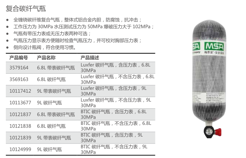 MSA Merthian 10117412 Luxfer Carbon fiber gas cylinder with pressure meter 30MPa 9L