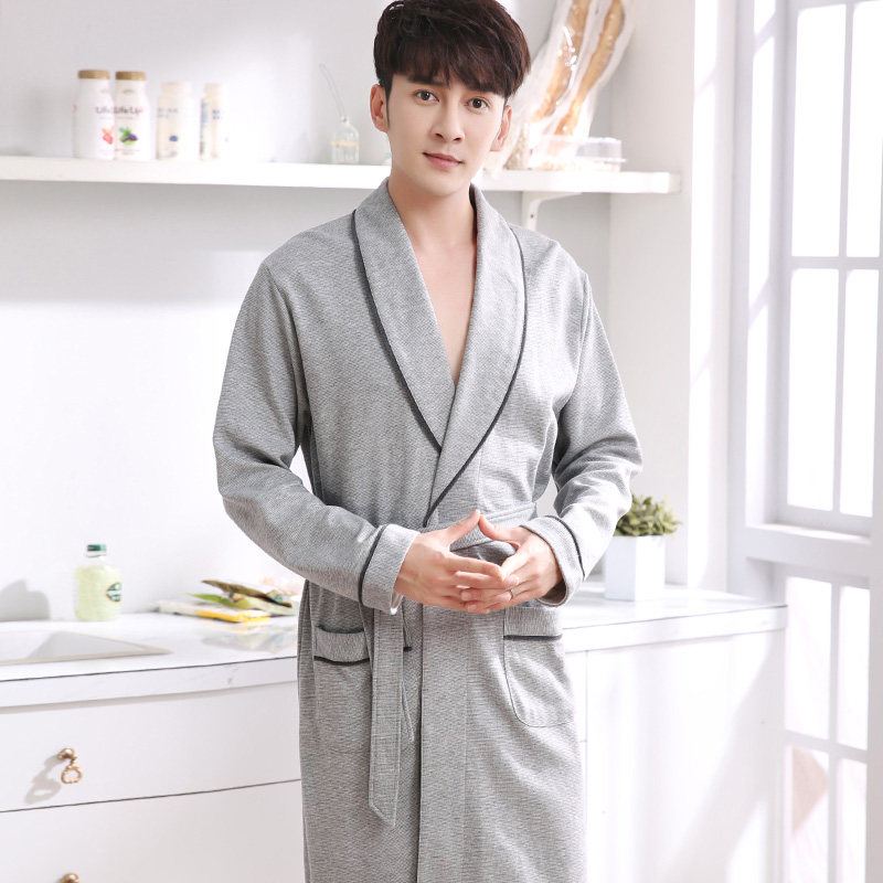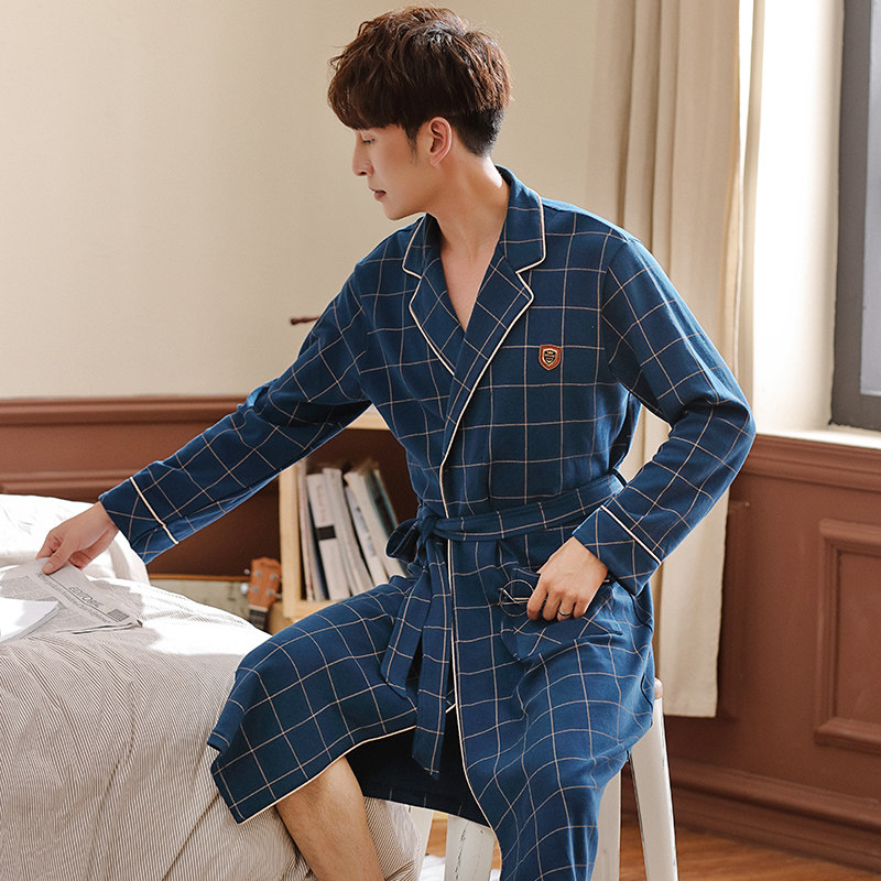 Spring and autumn men's nightgown Cotton long-sleeved large size men's yukata Autumn bathrobe one-piece long version spring and summer pajamas