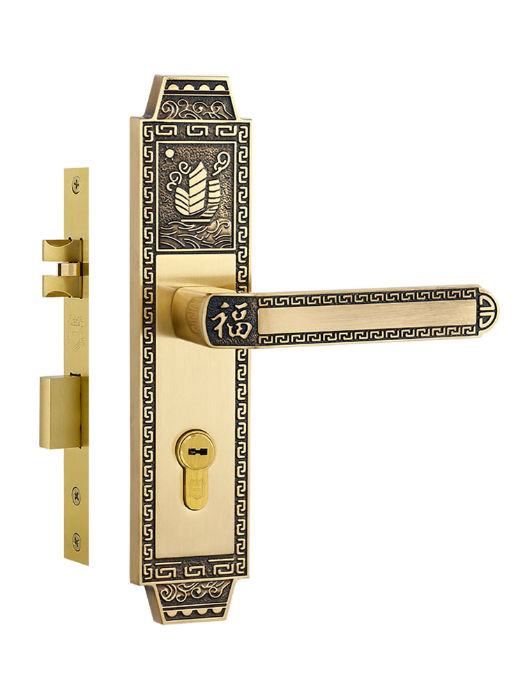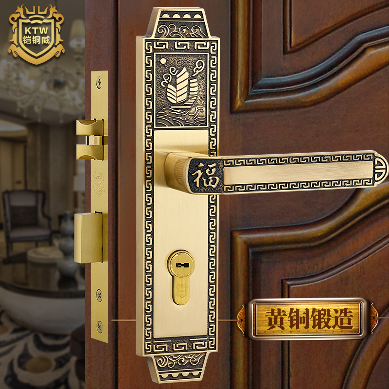Armored copper Wei new Chinese-style villa pure copper mute room door lock all copper indoor solid wood door antique bedroom board hand lock