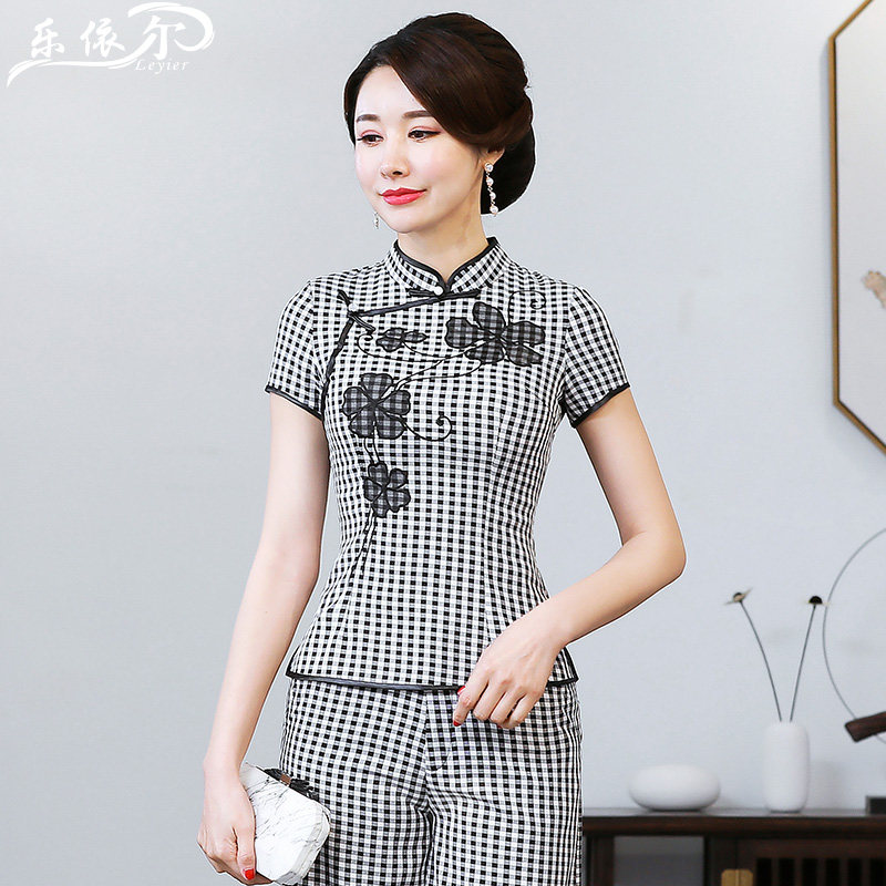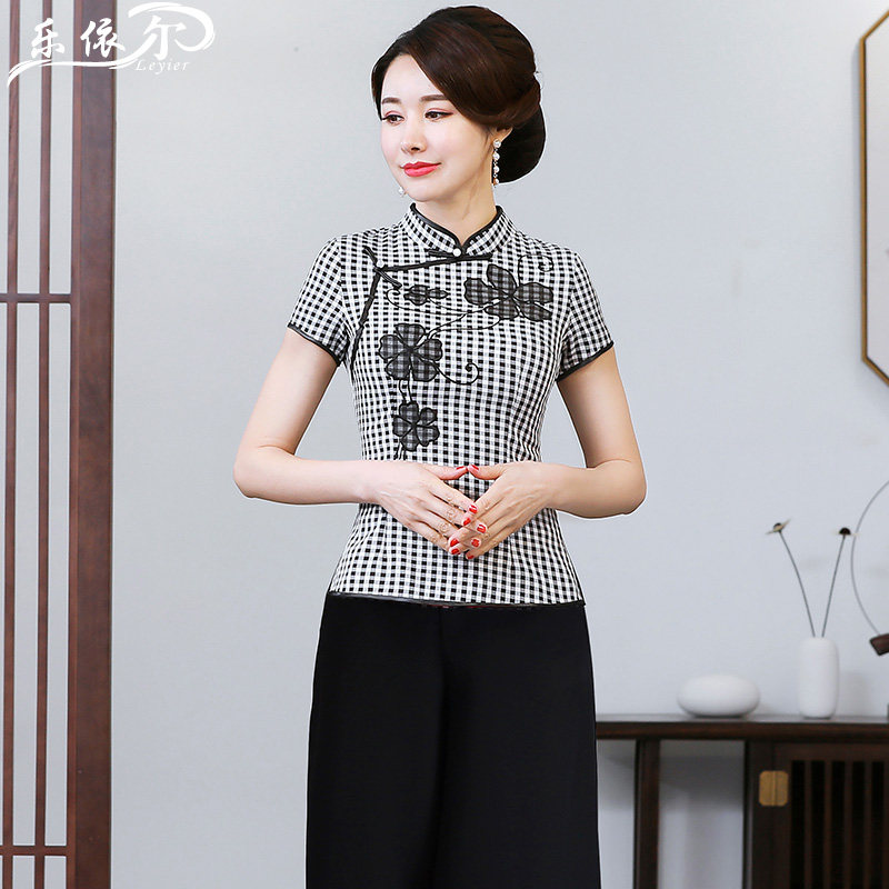 Summer new thousands of bird gowns qipao blouse blouse shorts embroidered retro plaid qipao qipao Dang suit Mom clothes big size