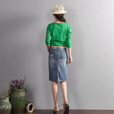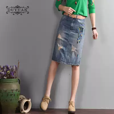 Denim skirt female summer hole fashion ethnic style embroidered middle skirt high waist Joker new bag hip slim skirt