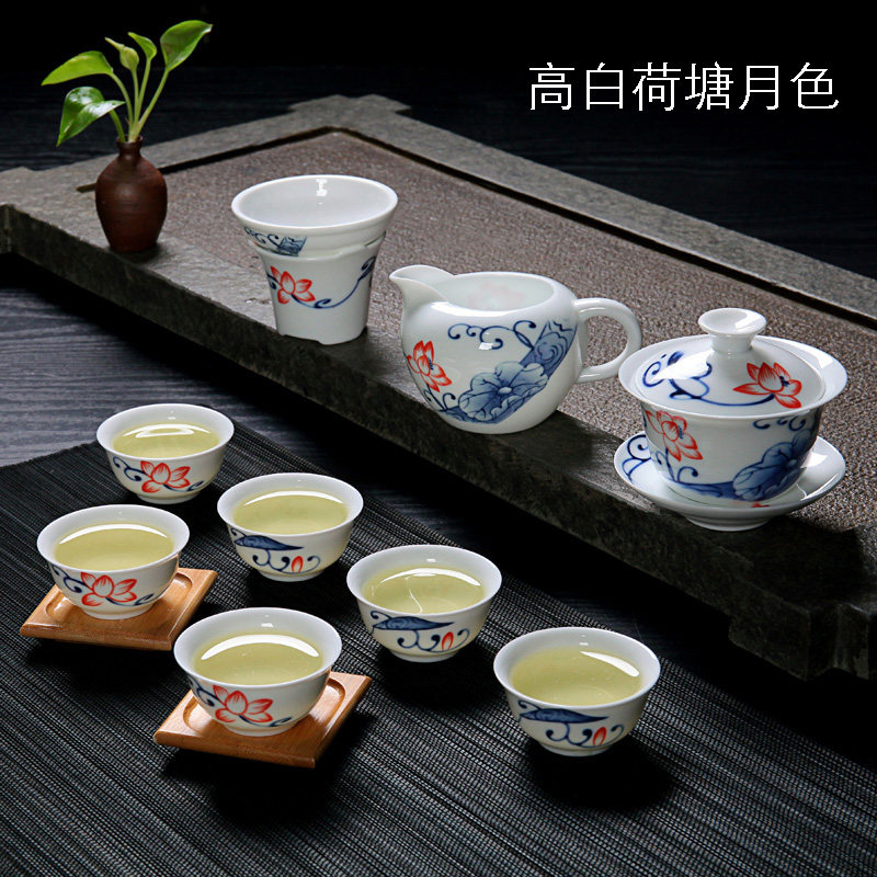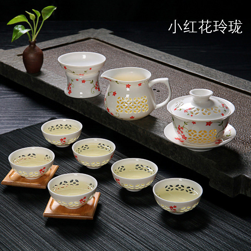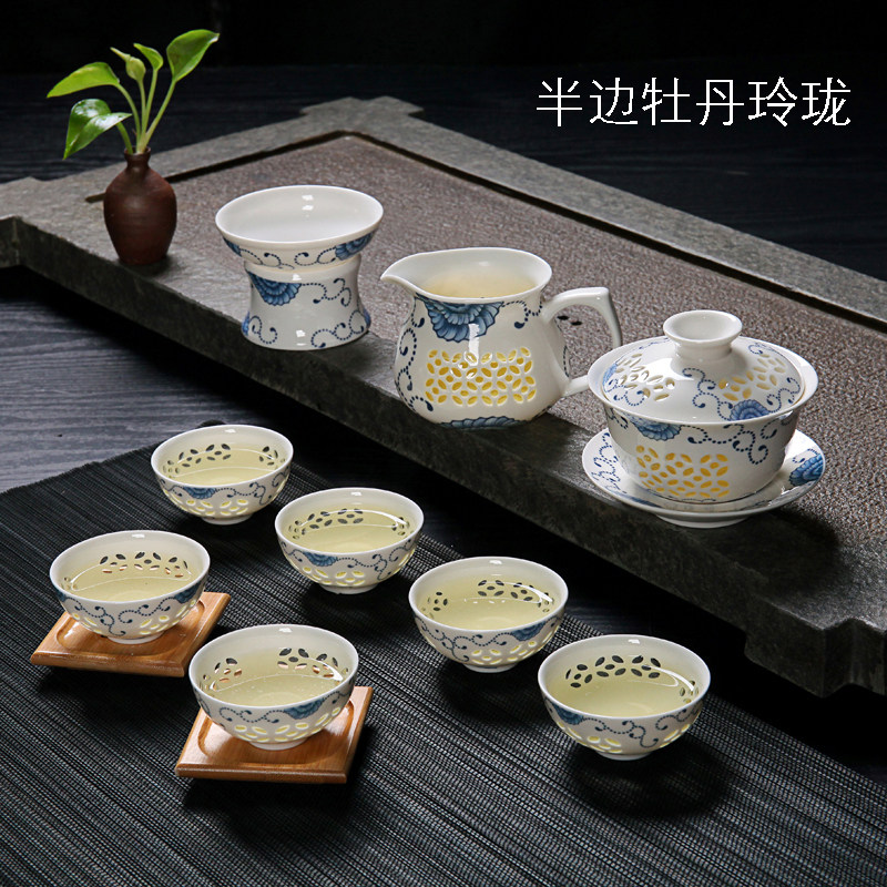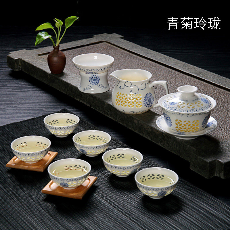 Ceramic tea set blue and white porcelain kung fu tea set complete tea set set hollow exquisite teacup thin tire hollow cover bowl town