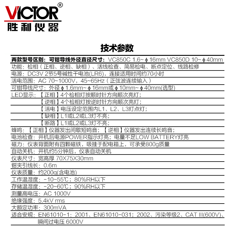 Victory VC850C phase sequence meter detector three-phase AC phase sequence meter phase sequence tester phase three-phase electric meter