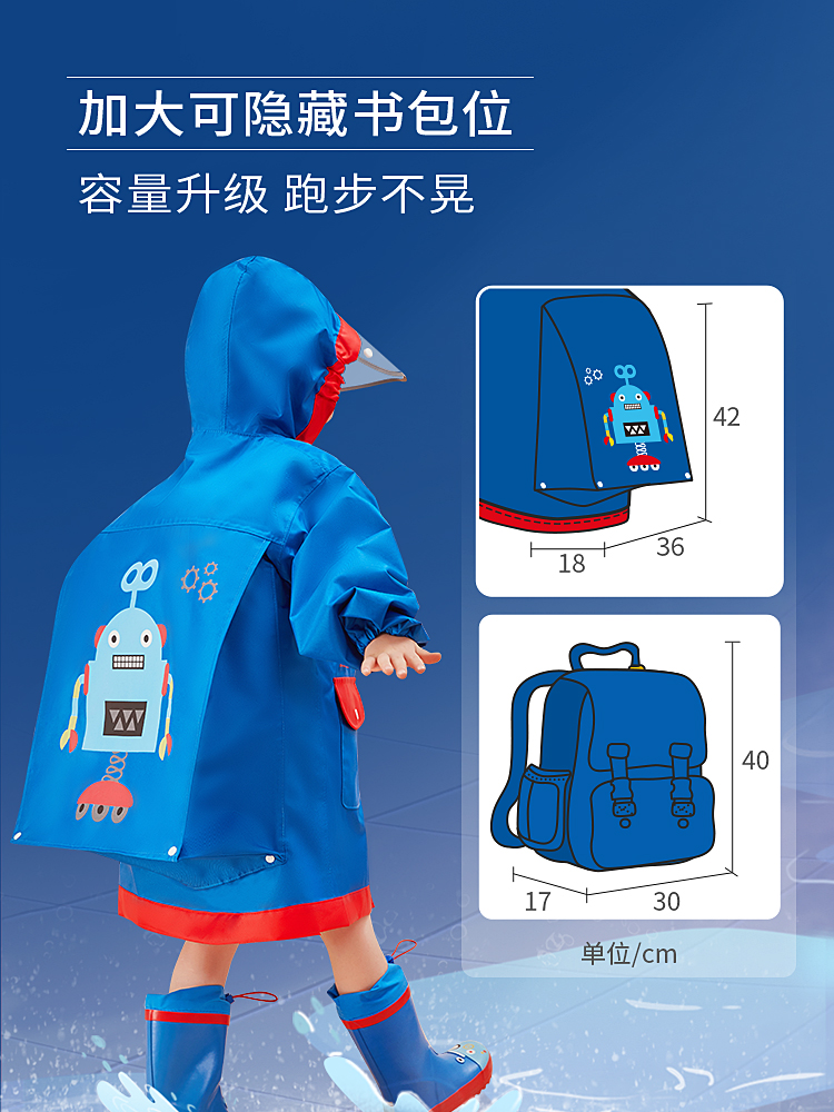 Children's raincoat, primary school poncho kindergarten rain gear, boys and girls, children's big hat brim with schoolbag position