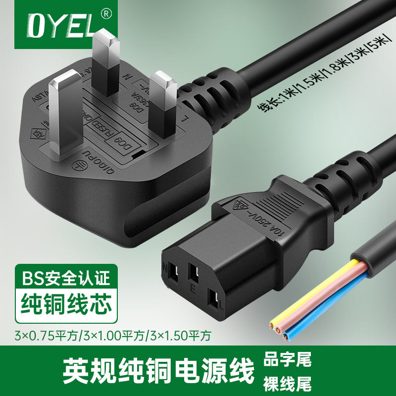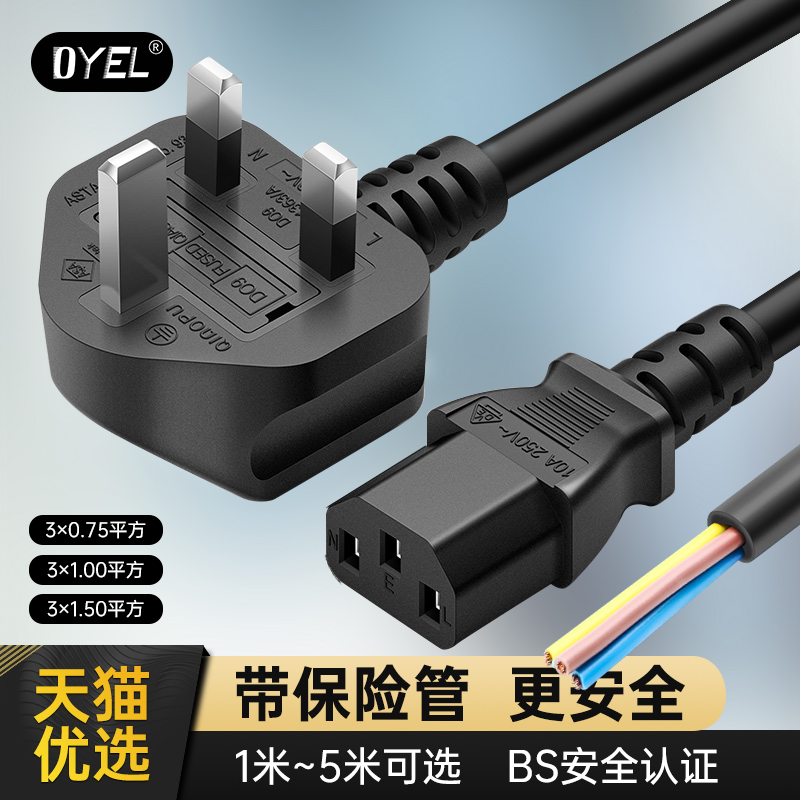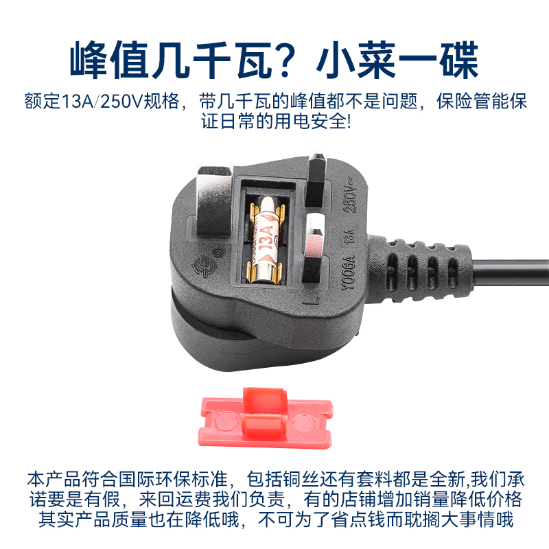 BS Certified British Gauge Three Inserts Pure Copper Power Cord With Insurance Tube Computer Host Power Cord Electric Rice Cooker Wire Three Holes