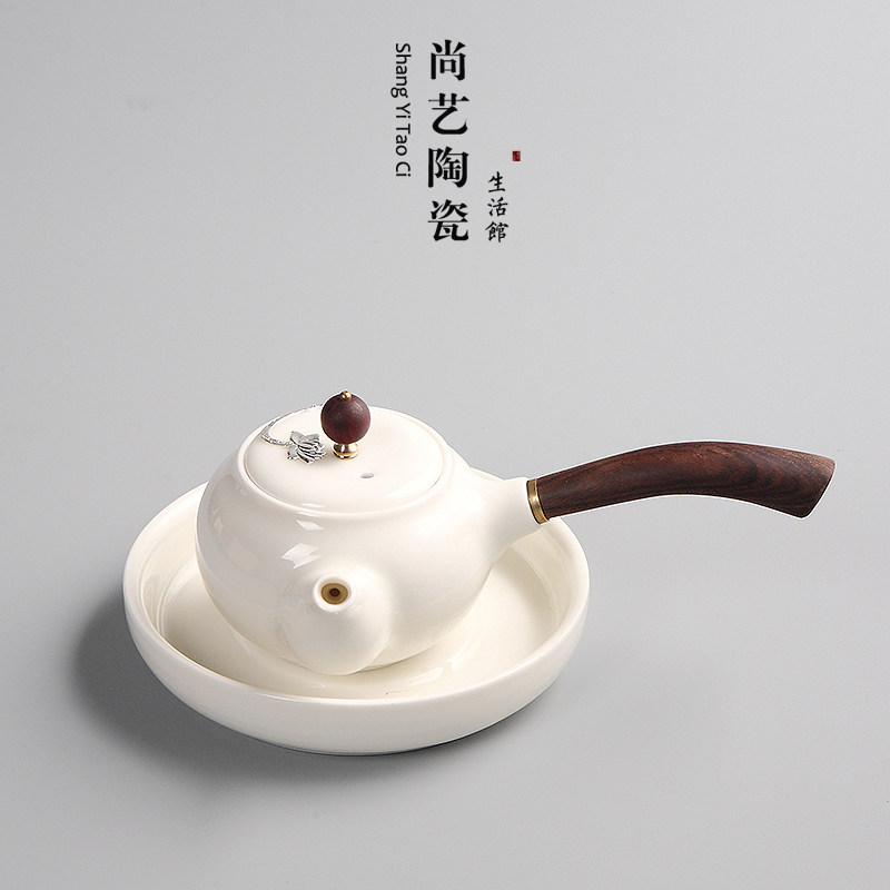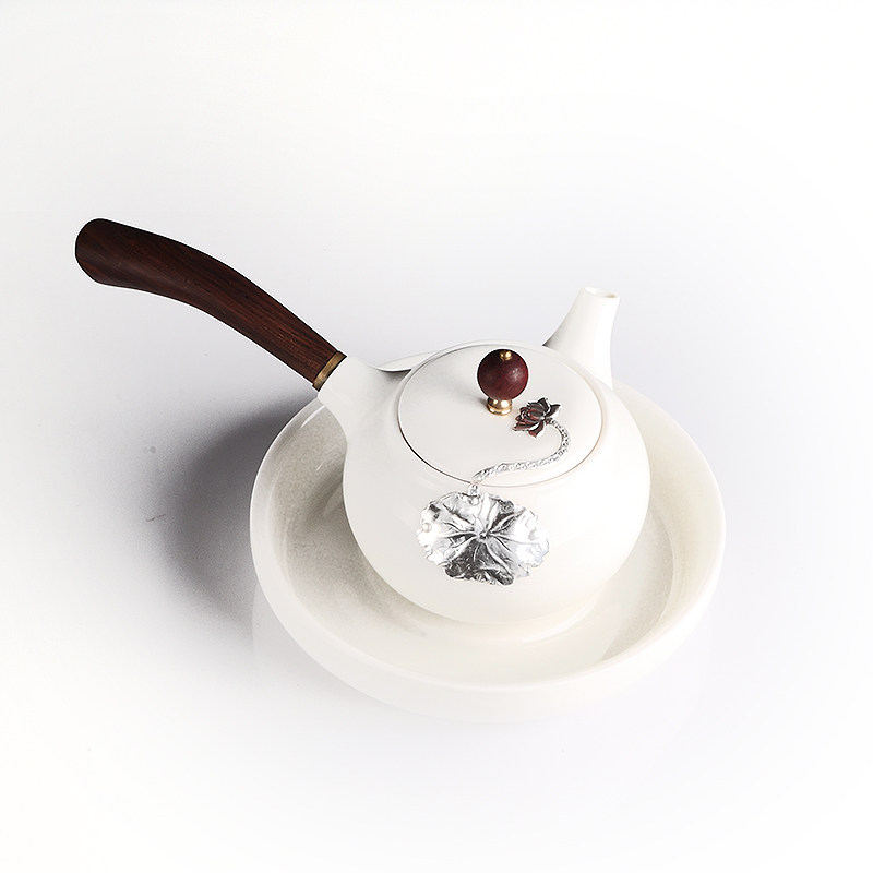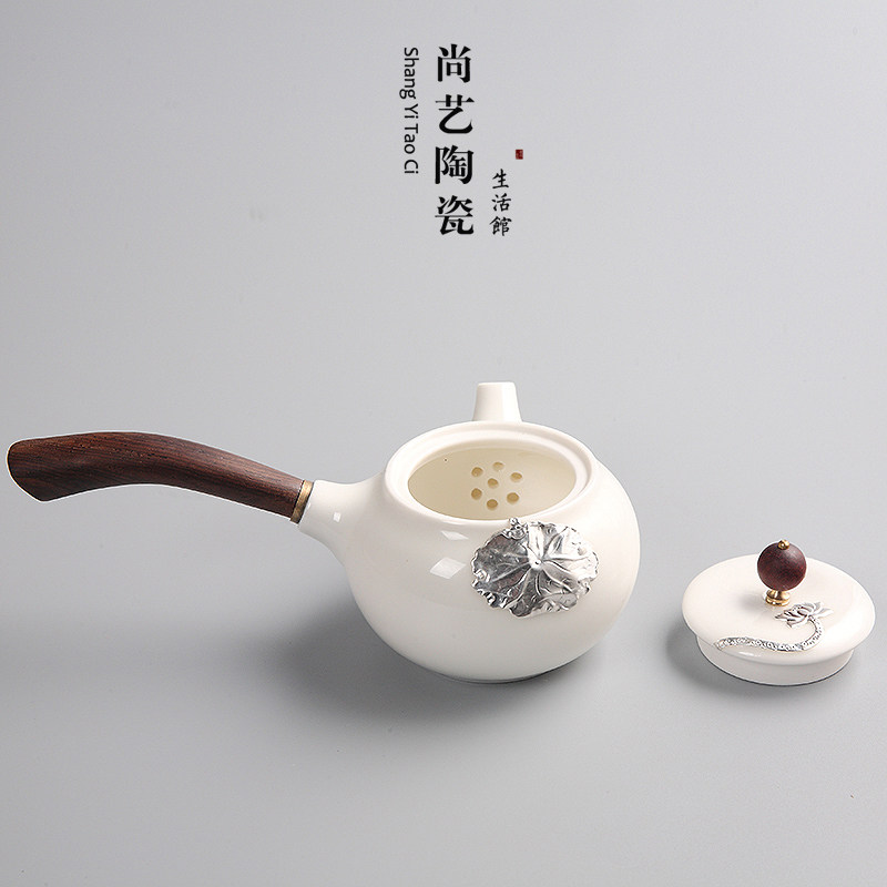 Jade white glaze hand-inlaid silver ceramic teapot Japanese side pot filter kung fu tea set tea wooden handle white porcelain single pot