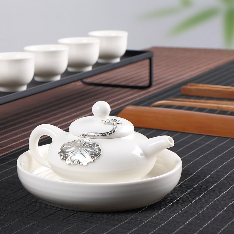 Jade White Side pot inlaid with silver front white porcelain pot with reel-inlaid with lotus leaves