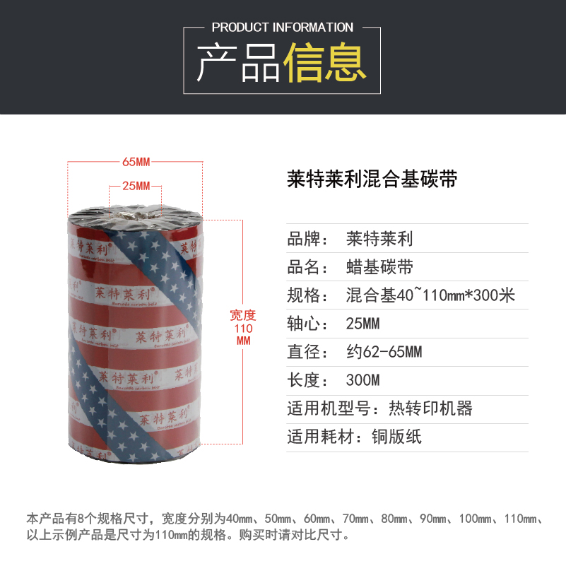 Reinforced mixed base ribbon 110*300m 100 90 80 70 60 50 40 Barcode printer self-adhesive coated paper Supermarket price tag outer box certificate of conformity