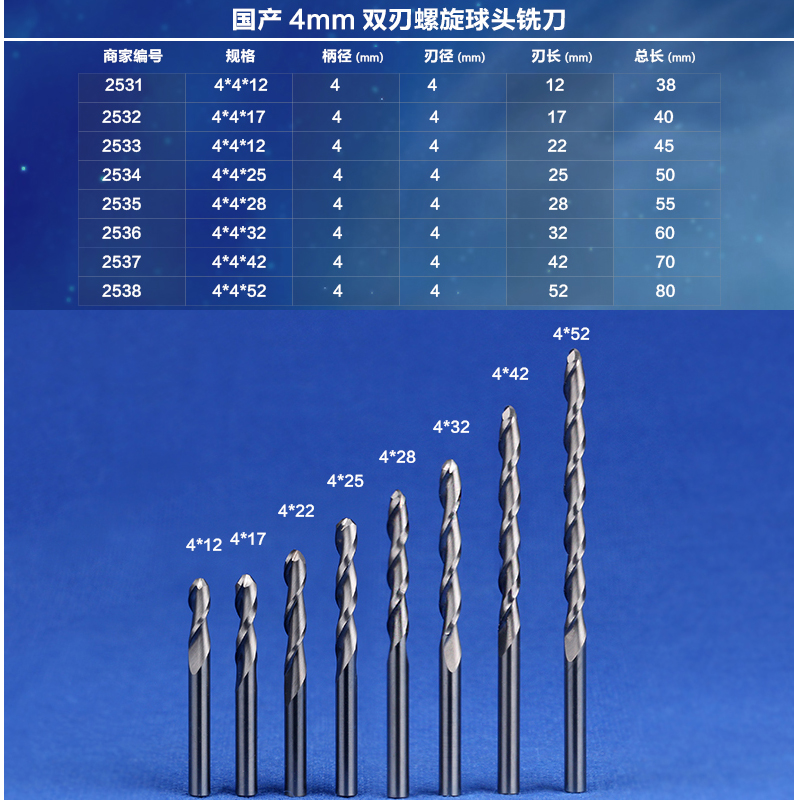 Excellent 4mm woodworking carved wooden carved double - edged ball - head milling cutter CNC advertising machine tool spiral knife