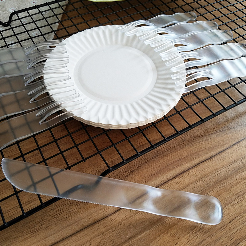 5 trays, 5 forks, 1 knife, 10 trays, 10 forks, 1 knife, 5 trays, 5 forks, 2 packs of disposable cake knives