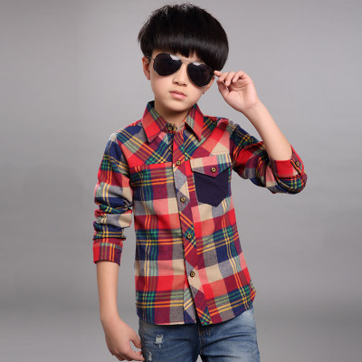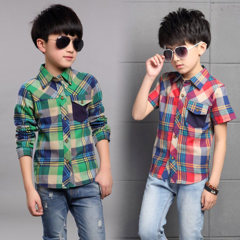 Children's clothing boy short-sleeved shirt spring clothing baby lapel spring and autumn plaid shirt in the big boy boy shirt tide Korean version