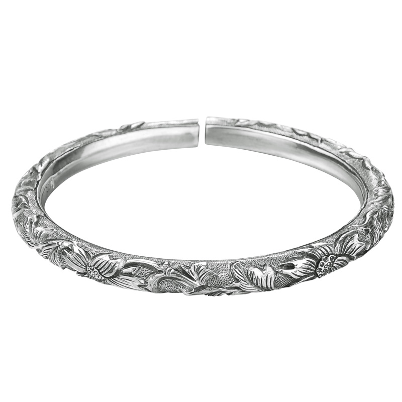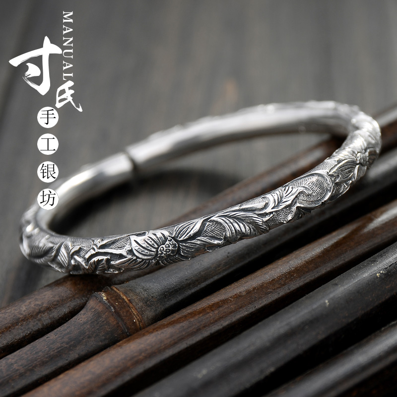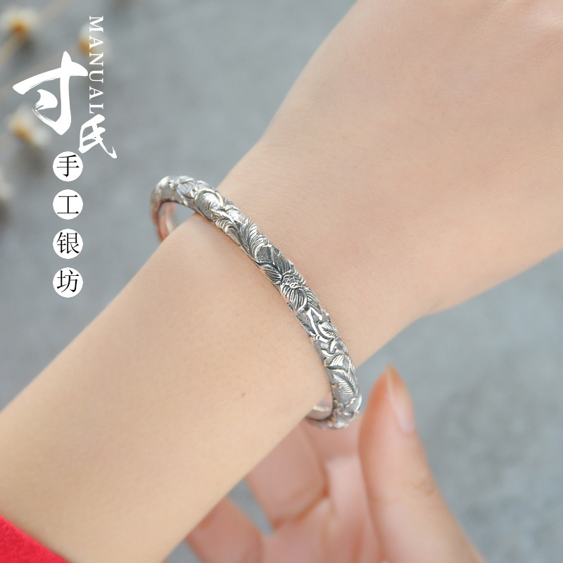 National style 99 foot silver pure handmade Yunnan snowflake silver cylinder full carved lotus silver bracelet personality women's sterling silver bracelet