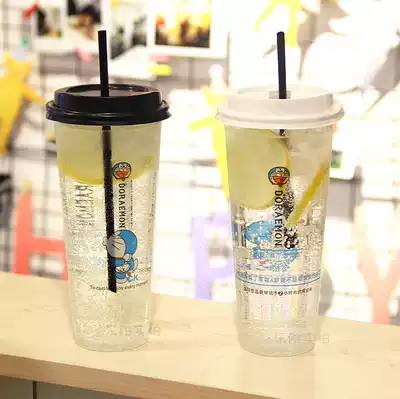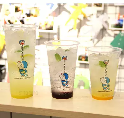 90 caliber Doraemon disposable plastic cup blue fat plastic milk tea cup 700ml slender high transparent cup