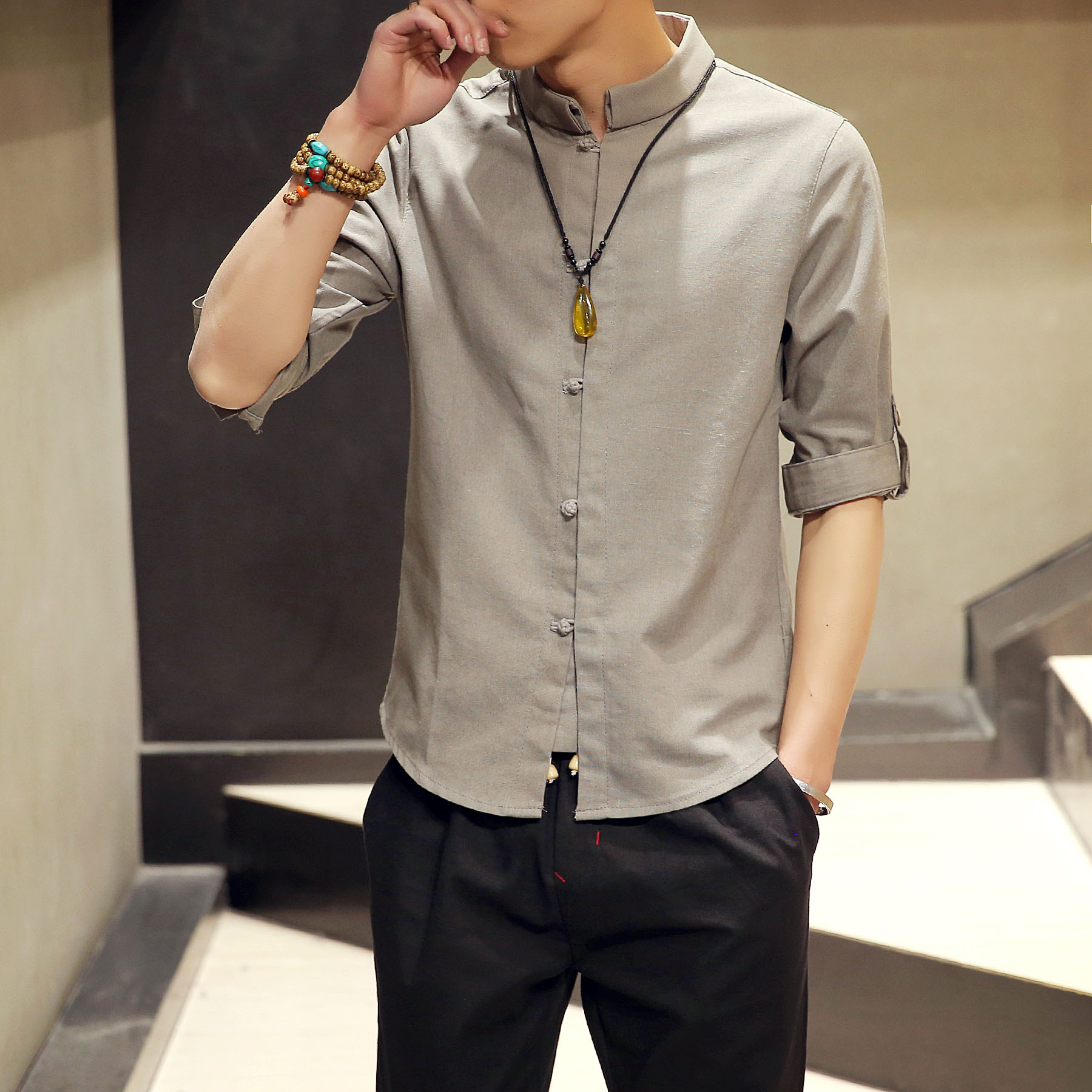 Summer Tang dress young man ancient style Buddha men's linen tunic Chinese style top slim Hanfu short sleeve 18