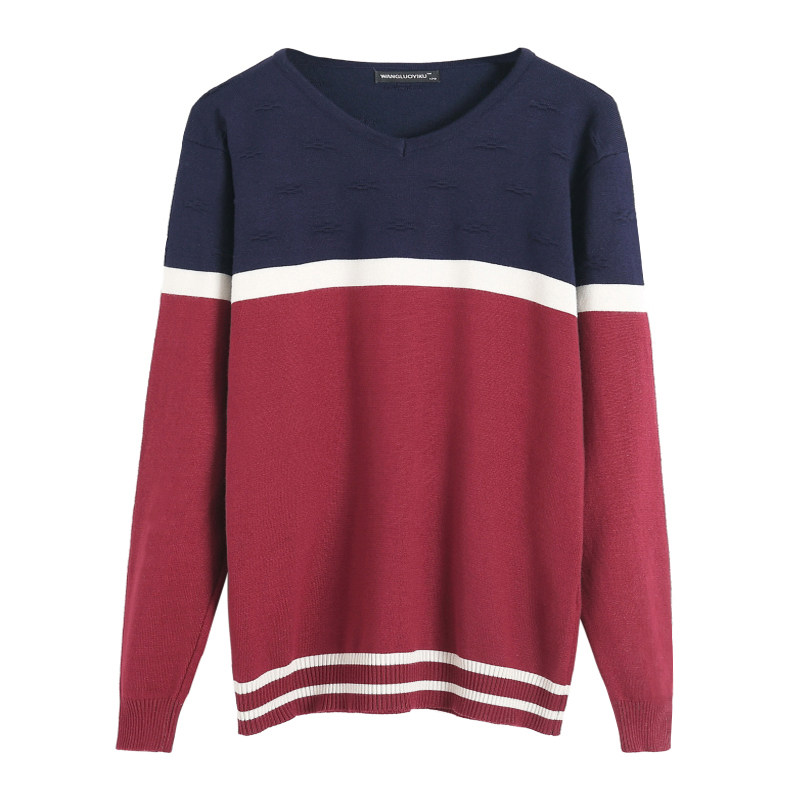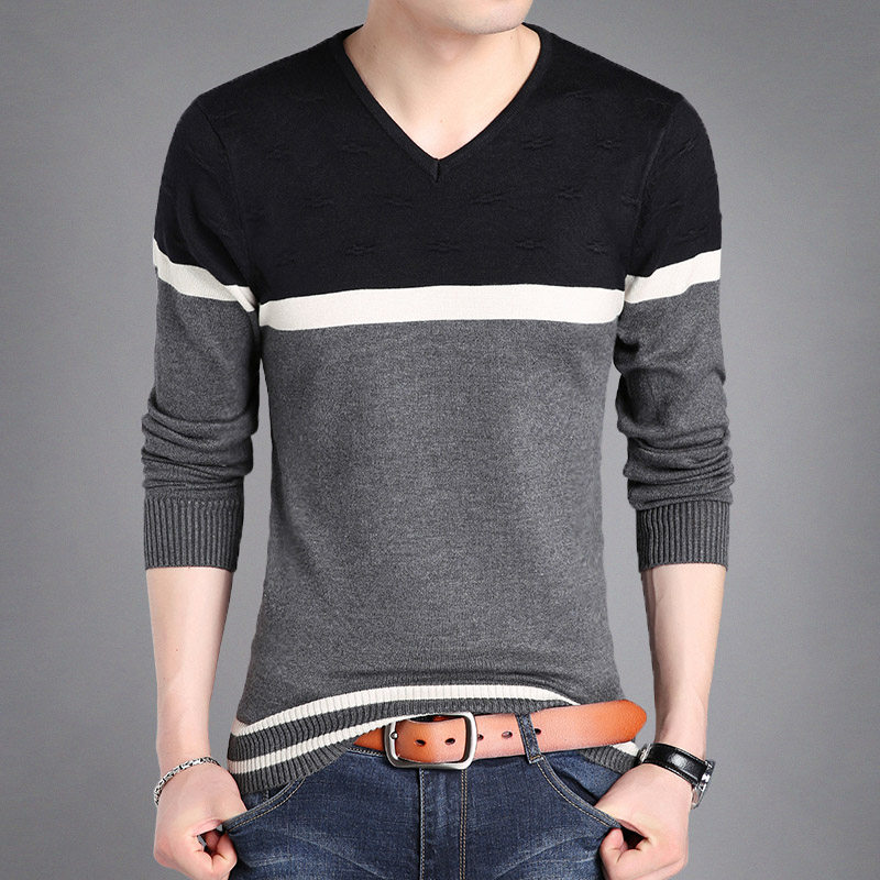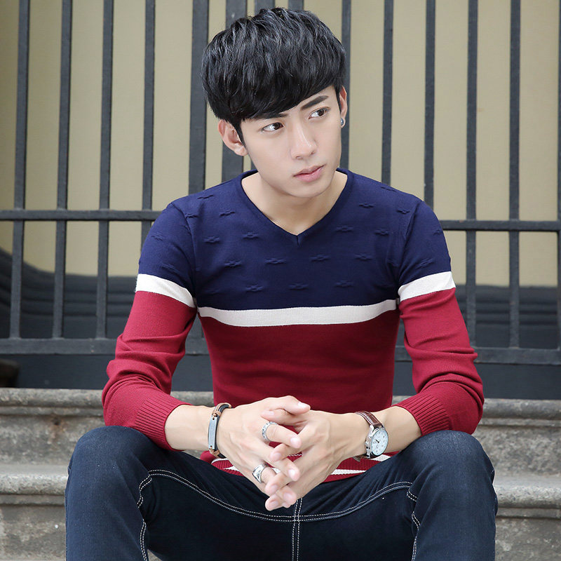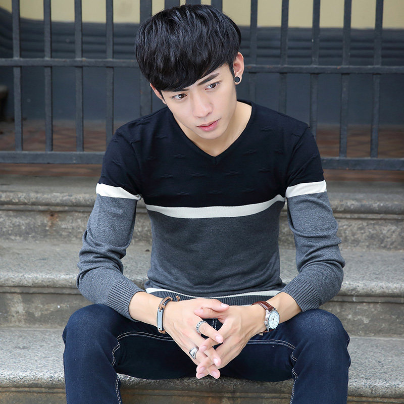 Fall new V-collar men's long sleeves T-shirt thin section Korean version swarm striped knit bottom-shirt large size-size wave men's clothing