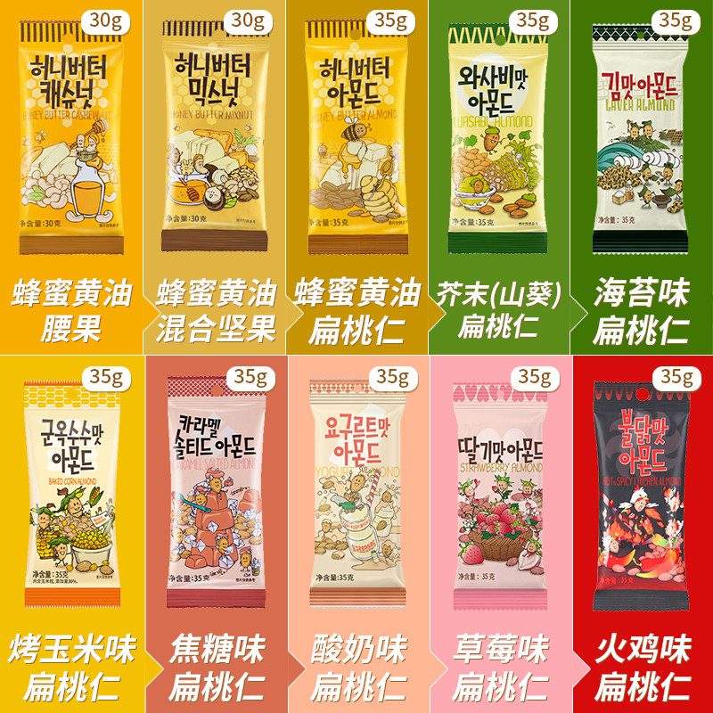 Optional flavor 5 bags (default random hair)Honey cream almond kernels 35g*5 bags Honey Cream cashew nuts 30g*5 bags (Wasabi)Mustard flavor almond kernels 35g*5 bags Honey mixed nuts