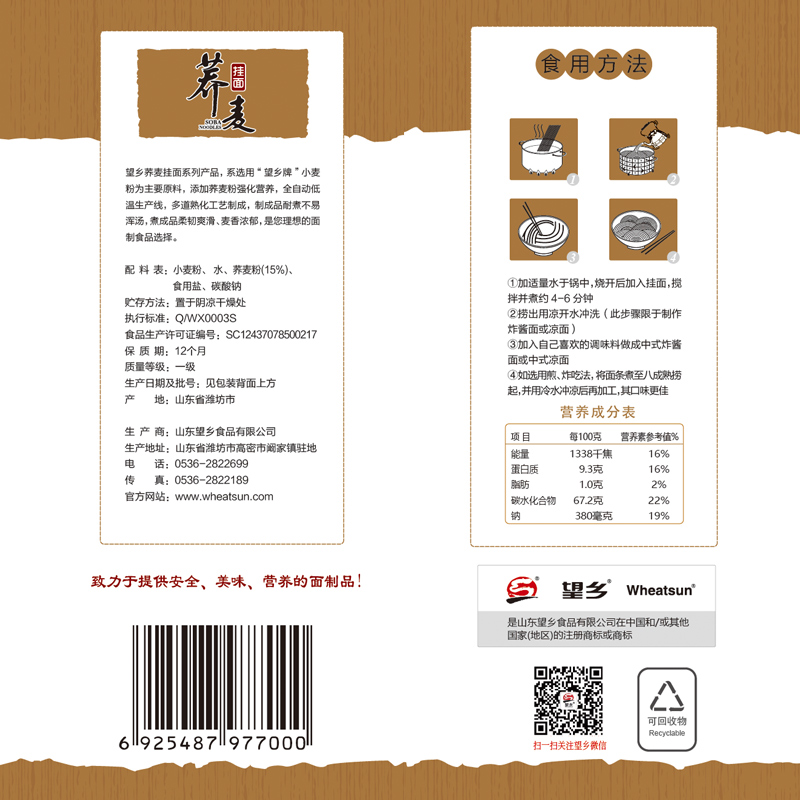 Wangxiang Soba noodles noodles sliced noodles Rye tartary buckwheat Low fat low-rise sugar-free fine Qiao mustard wheat 0 pure