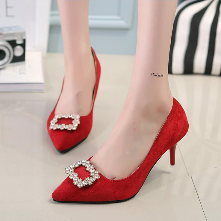 Large size reverse string high heels 40~43 size pointed shallow mouth thin heel square buckle CD fake mother cross-dress high heels wedding shoes