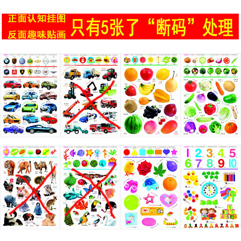 Five double-sided flip chart stickers “broken code” handle world famous car front flip chart reverse sticker fruit front flip chart reverse sticker vegetable front flip chart reverse sticker color shape front flip chart reverse