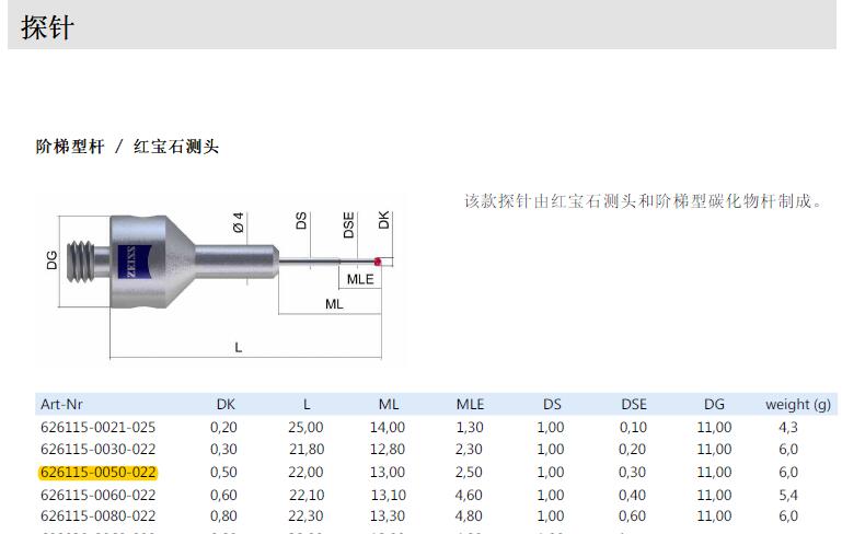 German Zeiss three coordinate probe 626115-0050-022 Ruby needle probe wrench