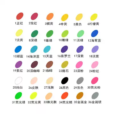 Yellow Gray Black Light yellow Violet Lemon yellow Dark purple Pink Sky blue Fuchsia Lake blue Fluorescent yellow Fluorescent green Metallic silver Light green ochre color Positive red skin color Ocean blue Orange yellow Light skin tone Light purple Sea