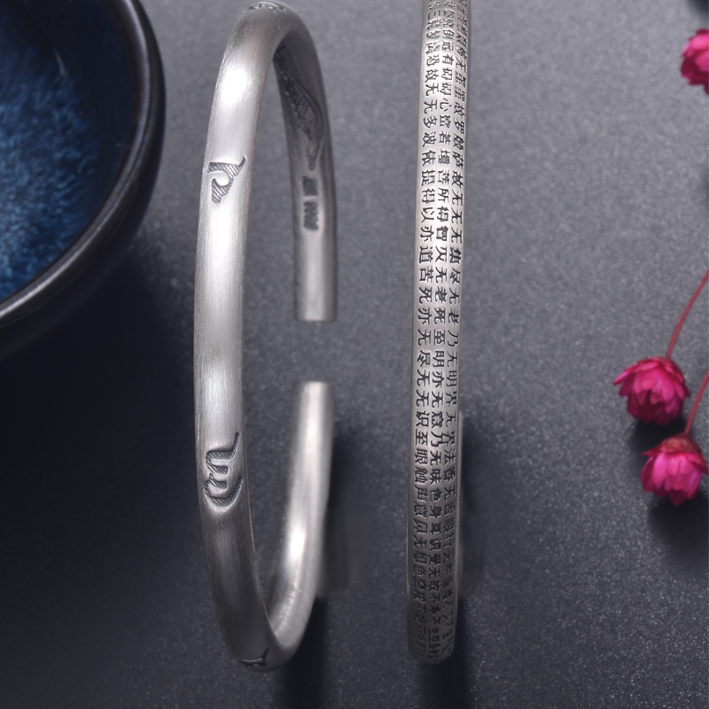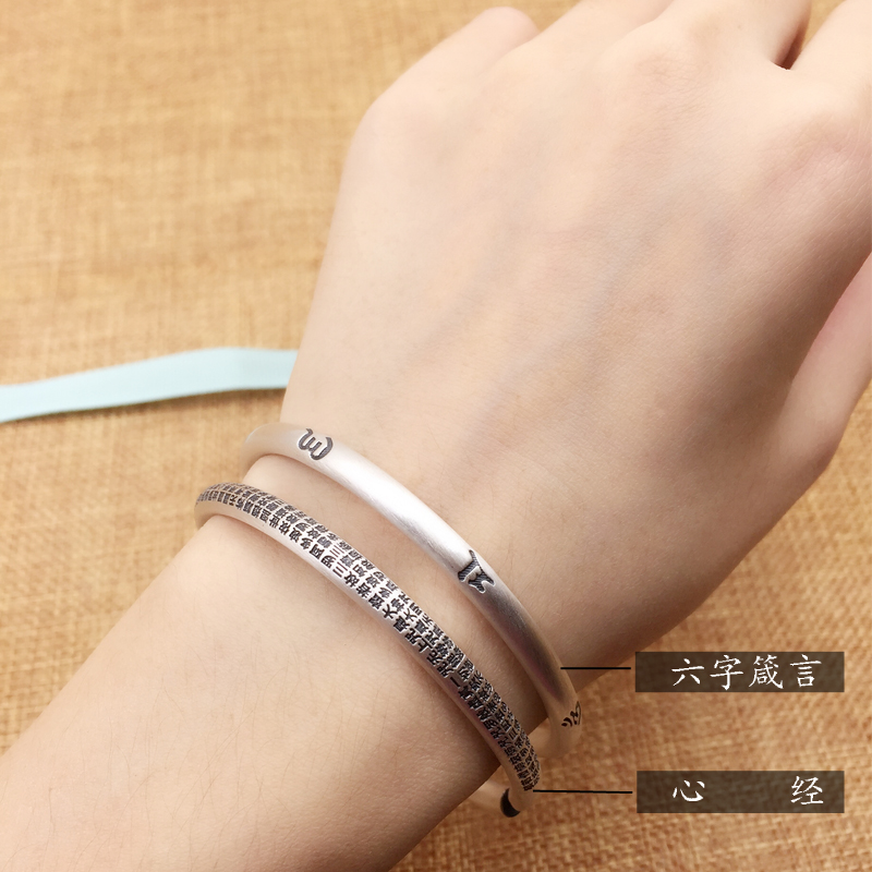 S999 foot silver Heart Sutra six words proverbs Matt solid sterling silver bracelet for men and women open round stick scripture couple bracelet
