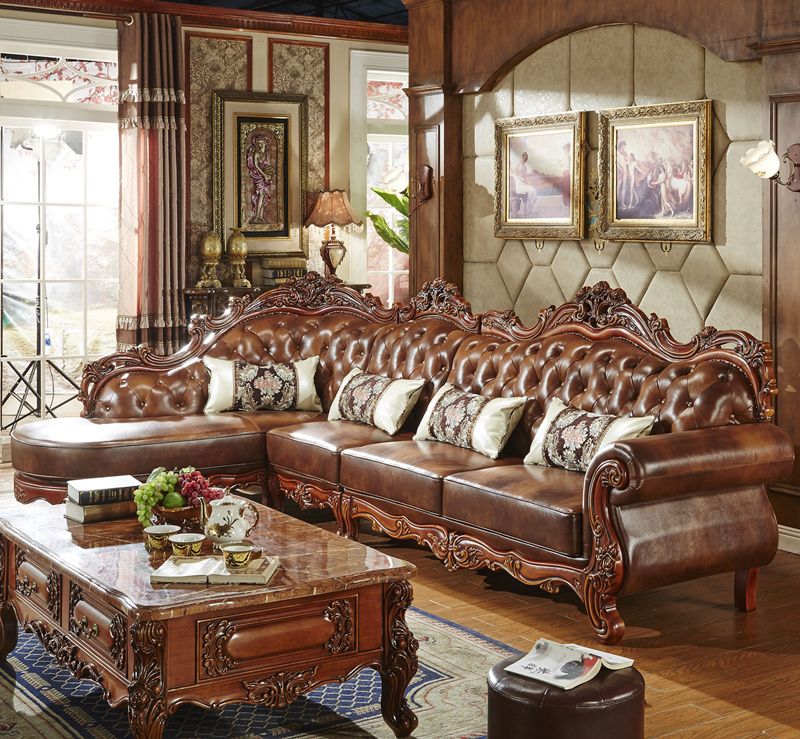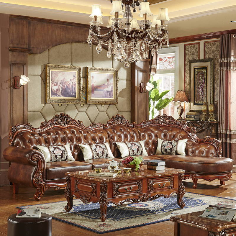 European-style leather sofa living room large apartment combination solid wood carved corner simple European luxury villa neo-classical furniture