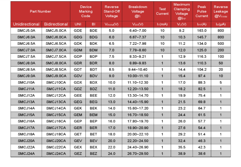 SMCJ15A One-way SMCJ15CA Two-way SMCJ18A One-way SMCJ18CA Two-way SMCJ24A One-way SMCJ24CA Two-way SMC