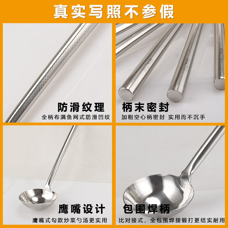304 Chefs special thickened frying spoon Long handle Stainless Steel Saute Spoon Large Soup Spoon Hotel Big Steel Handle Non-slip Hand Spoon