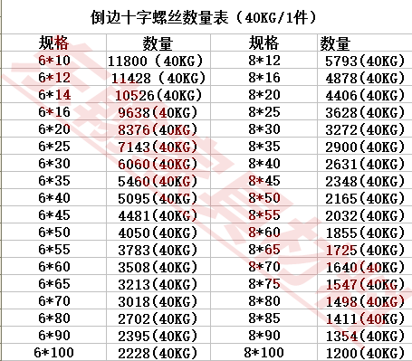 6*10(295pcs 1KG)6*16(241pcs 1KG)6*20(209pcs 1KG)6*25(178pcs 1KG)6*30