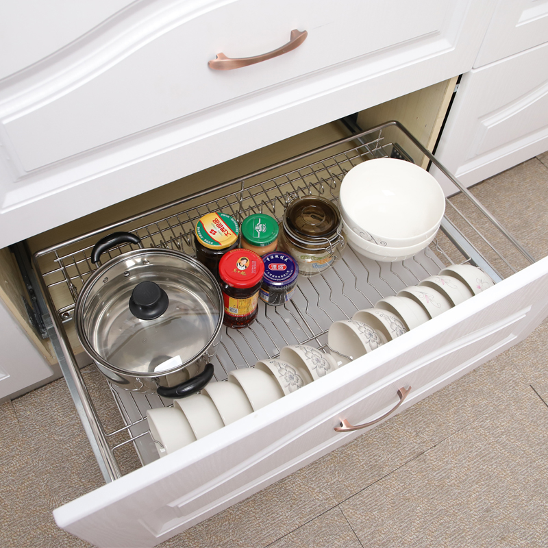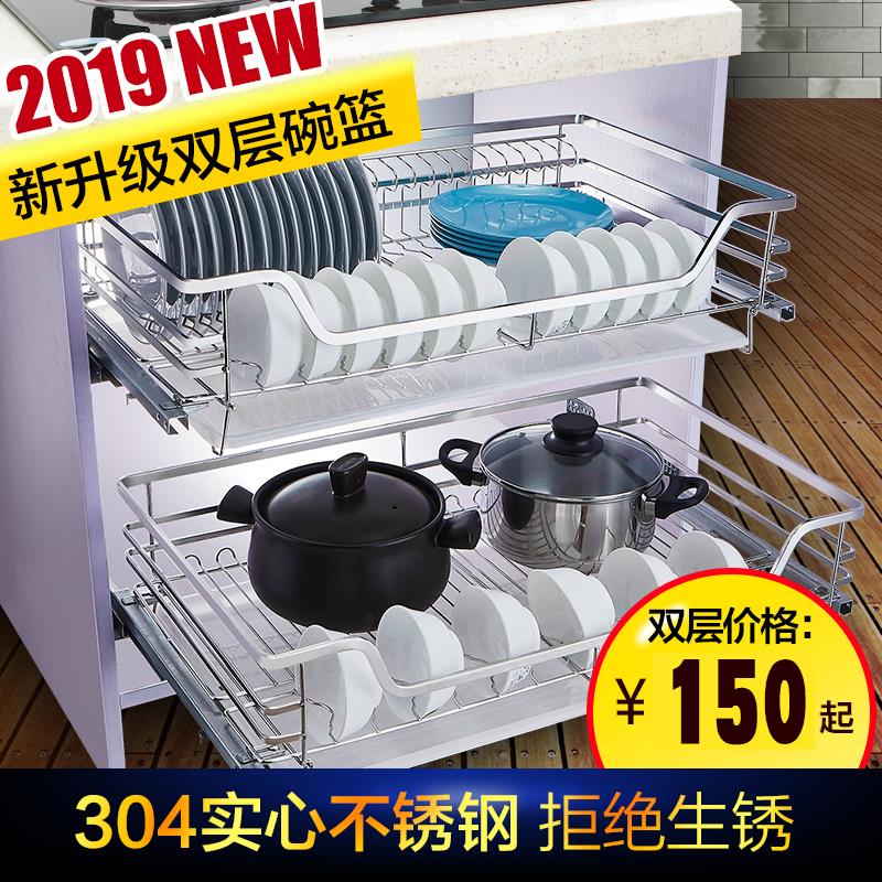 304 Pull Basket Stainless Steel Solid Damping Cushion Integral Cabinet Pull Blue Drawer Bowl Rack Double Bowl dish Kitchen Bowl Pull Basket