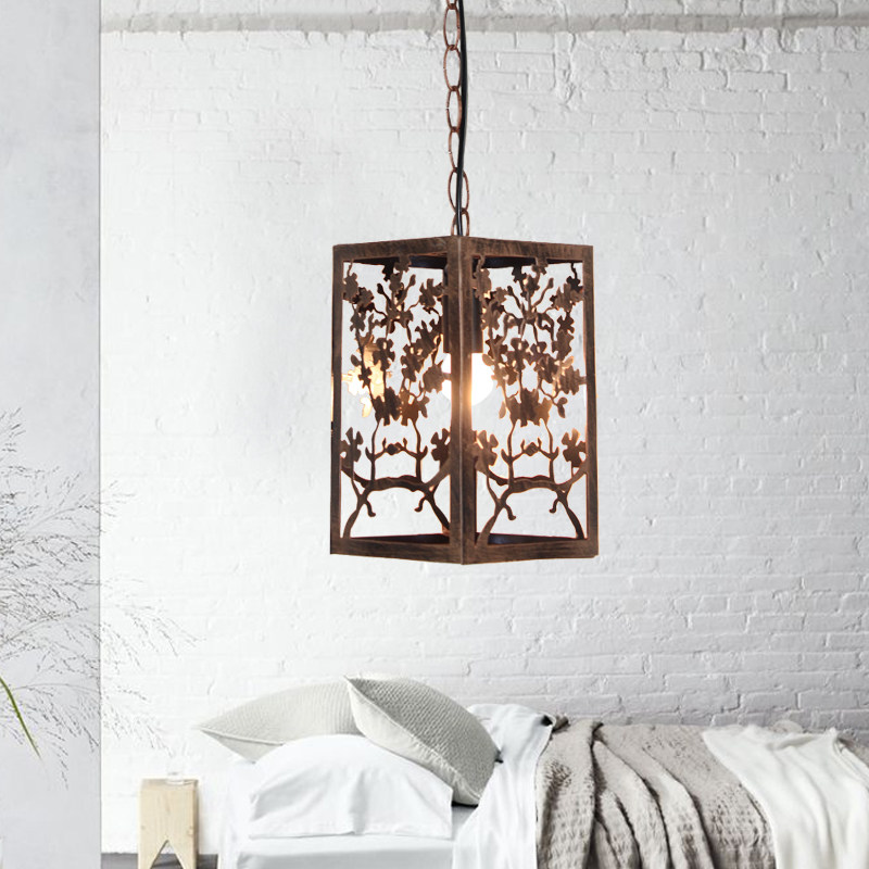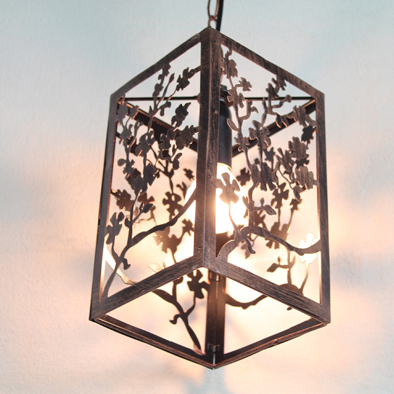 An iron art chandelie with a lamp