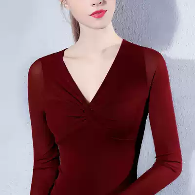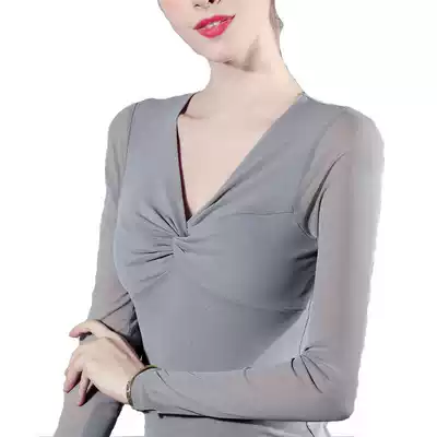 New Latin national standard dance low-cut V-neck long-sleeved female cross mesh slim dance small shirt practice uniform