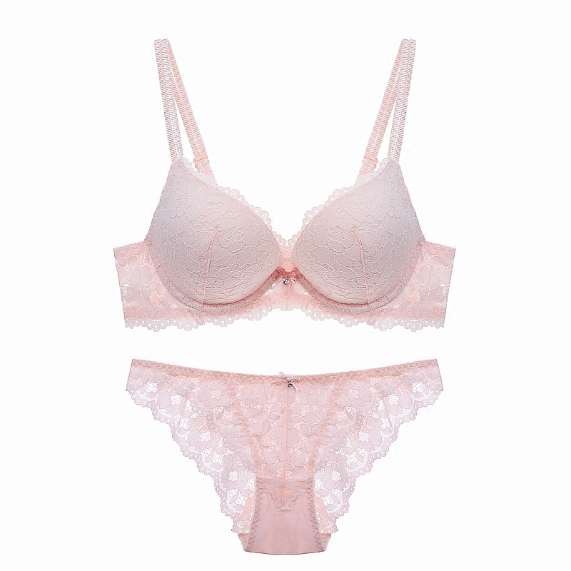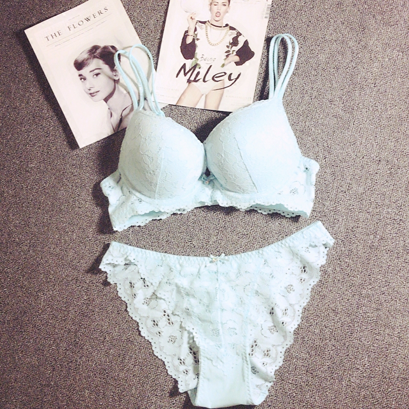 European and American girl sexy lace embroidery on thin under thick underwear set Deep V small chest gathered thickened women's underwear