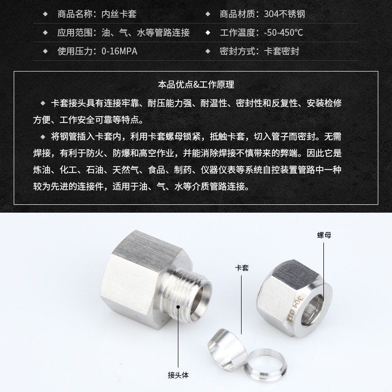 304 stainless steel card sleeve connector Pressure gauge connector inner wire straight card sleeve connector M10 M14 M16 M20