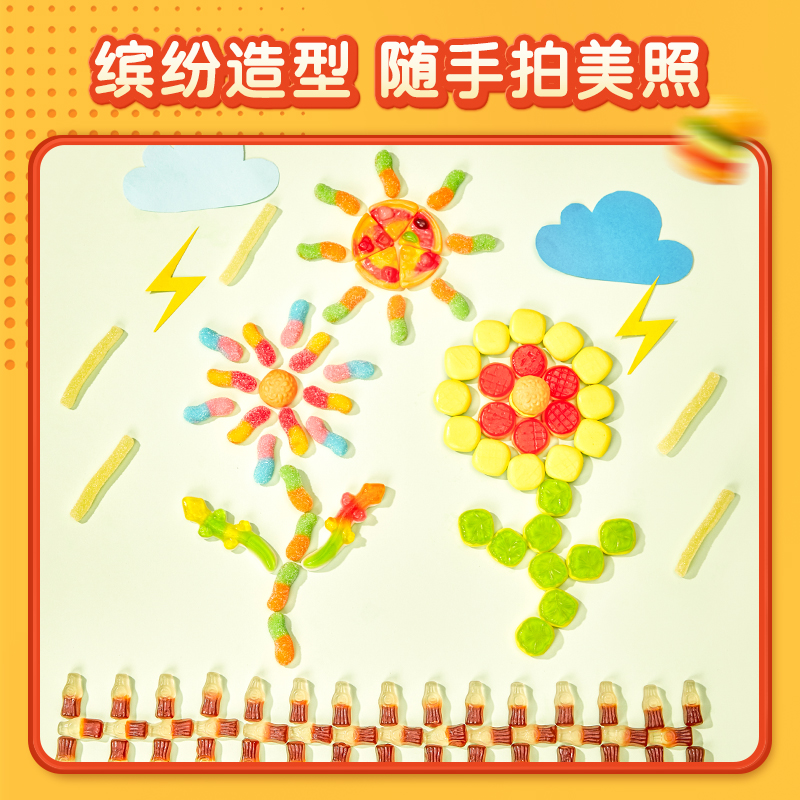 Glucose syrup, white sugar, food additives (gelatin, citric acid, pectin, temptation, red lemon, yellow, bright blue), edible flavor, etc.