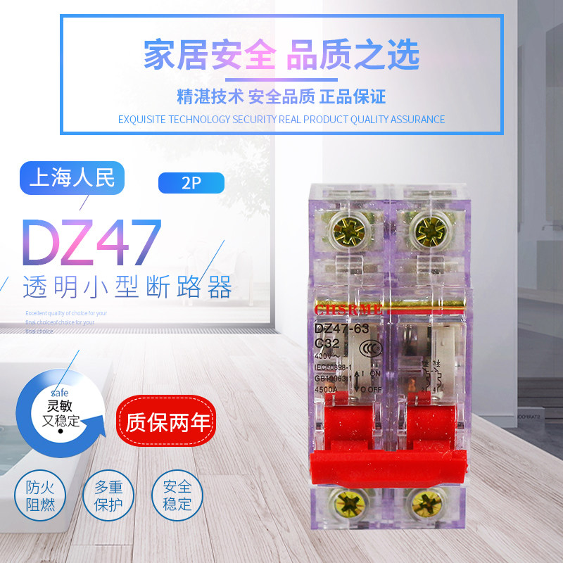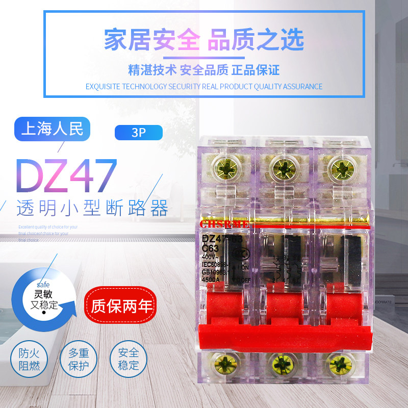 Shanghai People's Small Circuit Breaker DZ47 Air Switch 1P 2P 3P 4P C32 63A Air Open Transparent