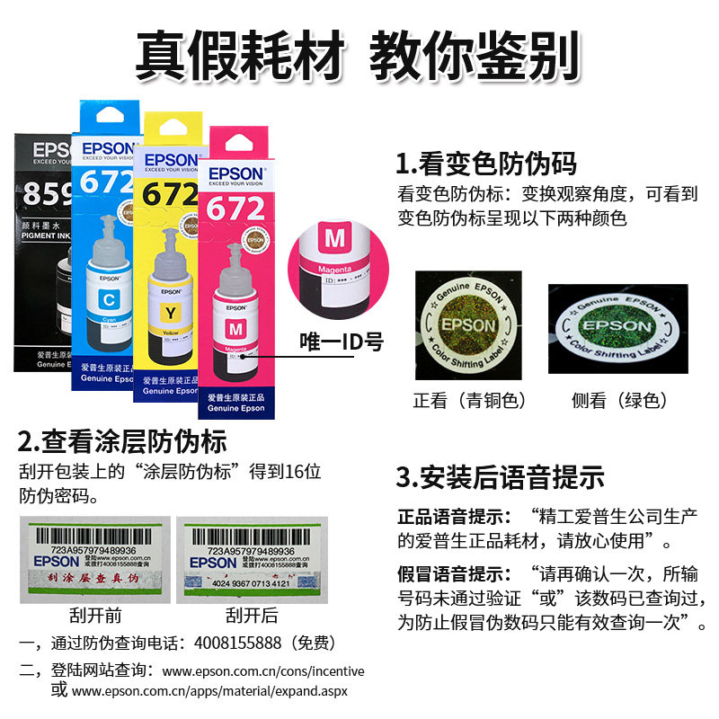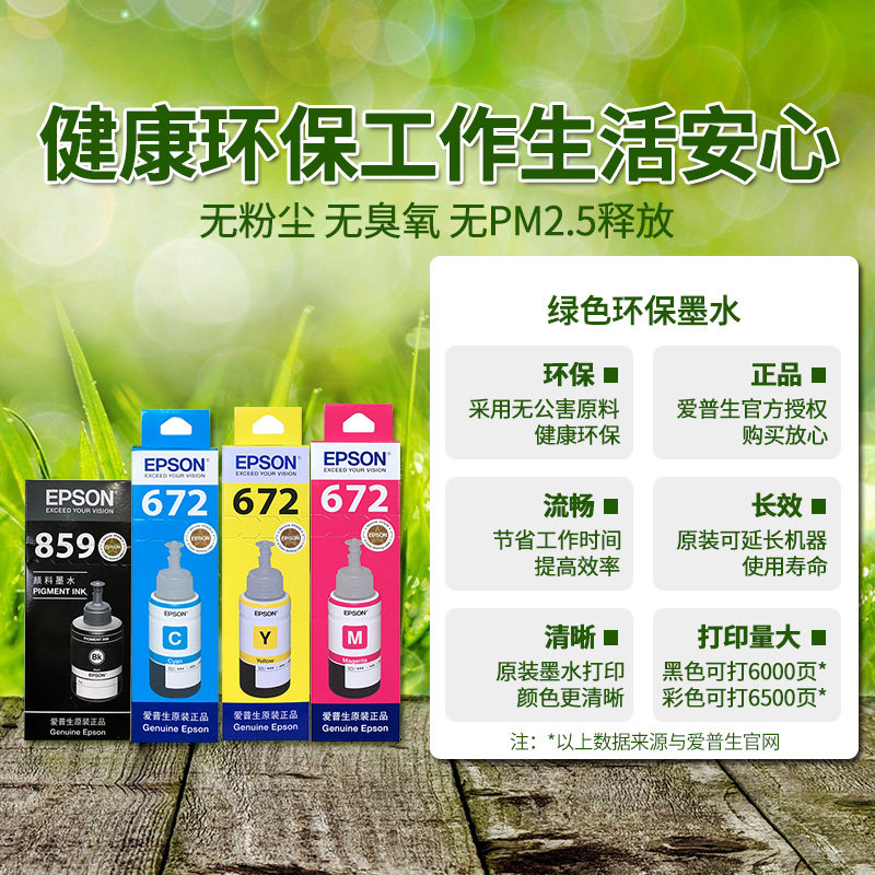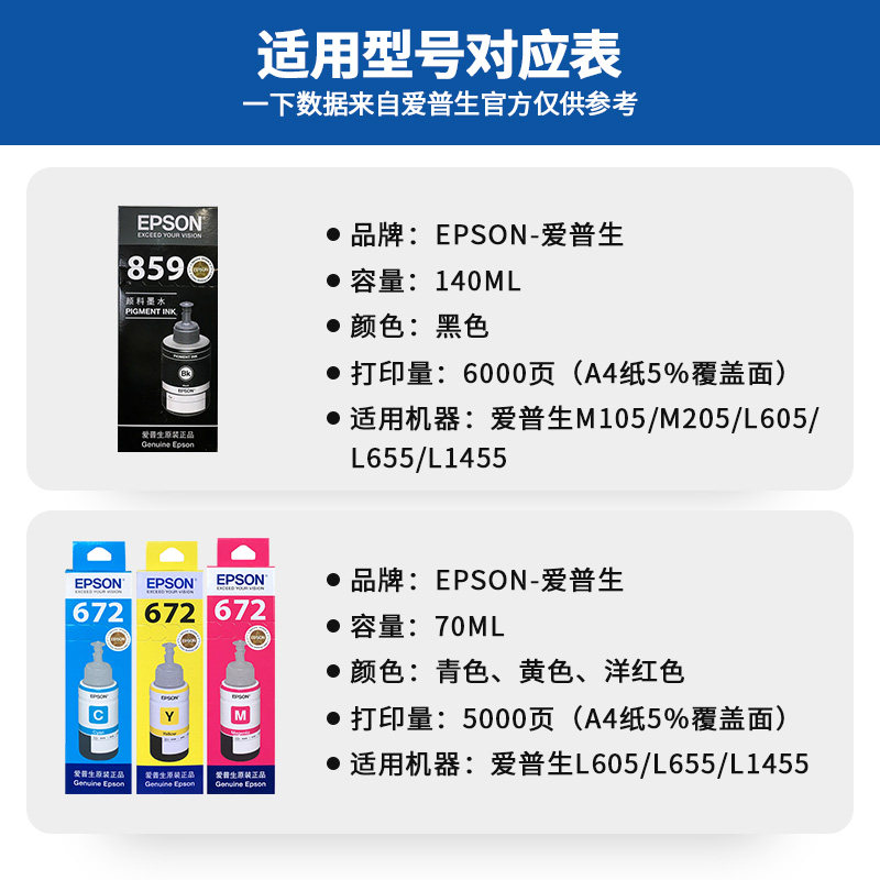 T8591 black 140ml (please consult customer service for orders) 859 set of four colors (please consult customer service for orders) T774 black (140ml for M101 M201 L655) T6723 magenta 70ml (5 percent coverage of A4 paper about printing 6500 pages) T6722 cyan 70ml (5 percent coverage of A4 paper about printing 6500 pages) T6724 yellow 70ml (5 percent of A4 paper coverage about printing 6500 pages) Epson Original 6 inch Photo Paper 2 Packs (183g 6" 20 Sheets)