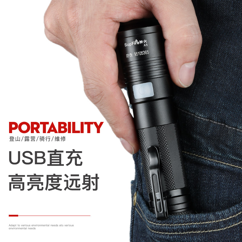 Shenhuo official flagship A5 strong light flashlight Ultra-long battery life Small portable ultra-bright outdoor rechargeable long-range home