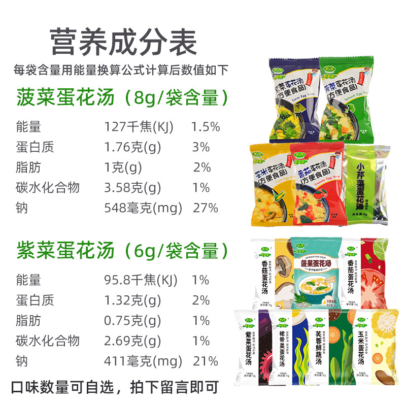 Spinach egg soup 8g*20 packs of purple egg soup 8g*20 packets of tomato egg soup 8g*20 packets of corn egg soup 8g*20 packs of celery egg soup 8g*20 packs of five tastes