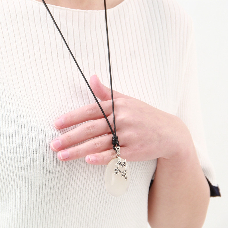Original pure silver natural jade medullary necklace lady s925 silver pendant retro simple autumn winter sweater necklace long version