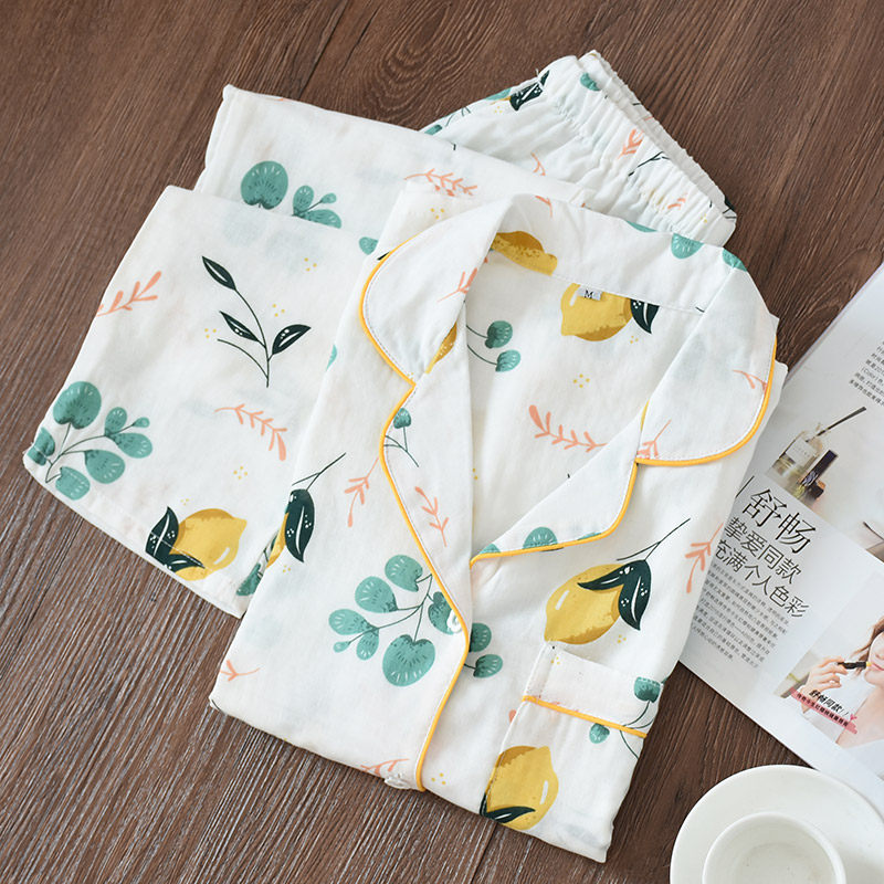 Sun-series spring autumn summer pure cotton double layer gauze sleeping clothes men and women full cotton long sleeve long pants lovers casual home suit suit