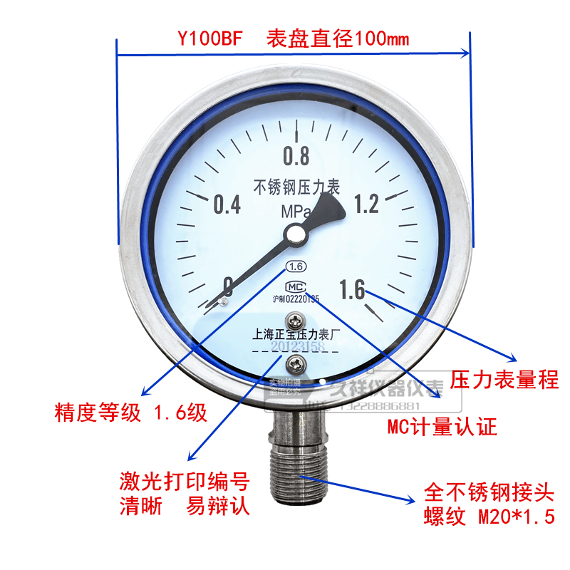 Shanghai Zhengbao Y100BF stainless steel meter high temperature resistance chlorine corrosion resistance pressure gauge shock YN100BF steam