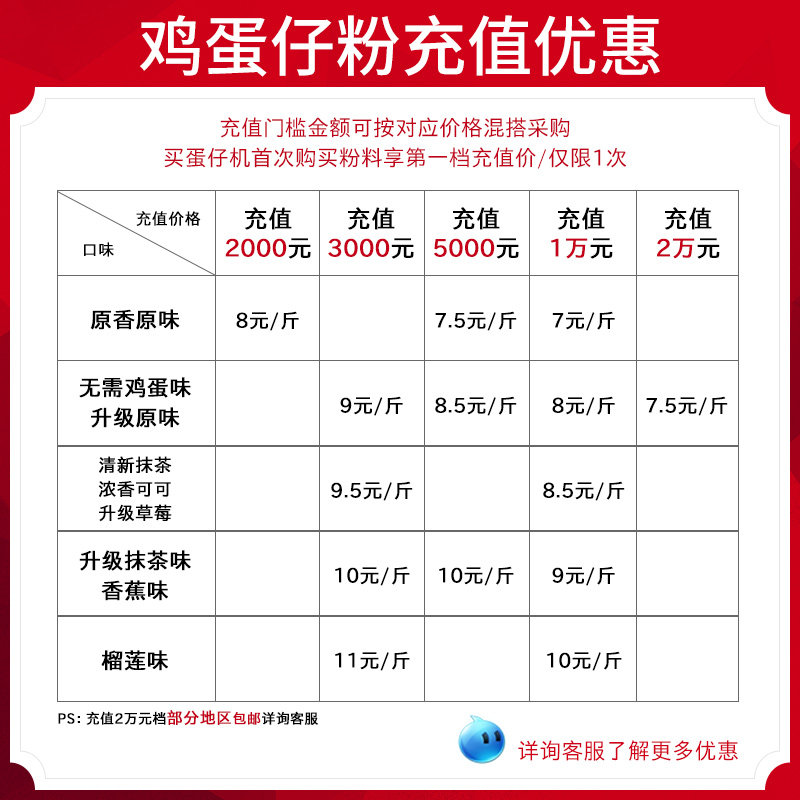 (Original flavor) 1 kg Bag (original flavor) 4 kg Bag 16 kg ) 9 yuan (original flavor) ( upgrade original taste ) 1 kg Bag ( upgrade original taste ) 4 kg Bag 16 kg ) 10 yuan (upgrade original flavor) (no need to add eggs) 1 kg Bag (no need to add eggs) 4 kg Bag 16 kg ) 10 yuan (no need to add eggs) 2 kg (fresh matcha) 2 kg bag 16 kg ) 10 yuan (fresh matcha) (strawberry) 2 kg bag, packaging temporarily changed (fragrant cocoa) 2 kg bag, pre-sale 15 days hair 16 kg (fragrant cocoa), Pre-sale 15 days hair (banana) 2 kg bag, packaging temporarily changed (durian) 2 kg bag (cheese salty) 4 kg bag 16 kg ) 10 yuan (cheese salty) (0 yuan trial shot) 250g bag (waffle powder) 2 kg bag recharge (as low as 7 yuan jin) contact customer service